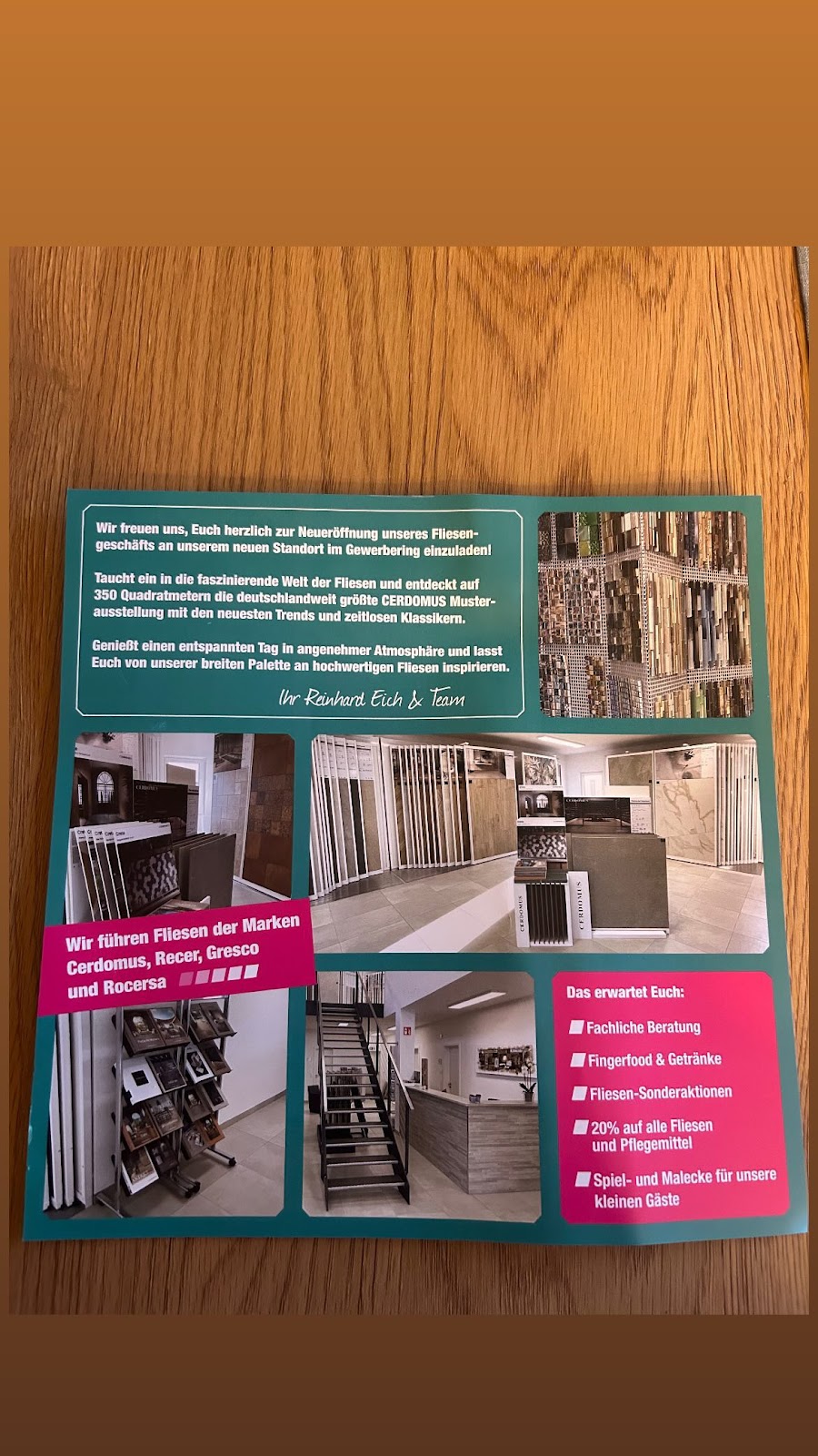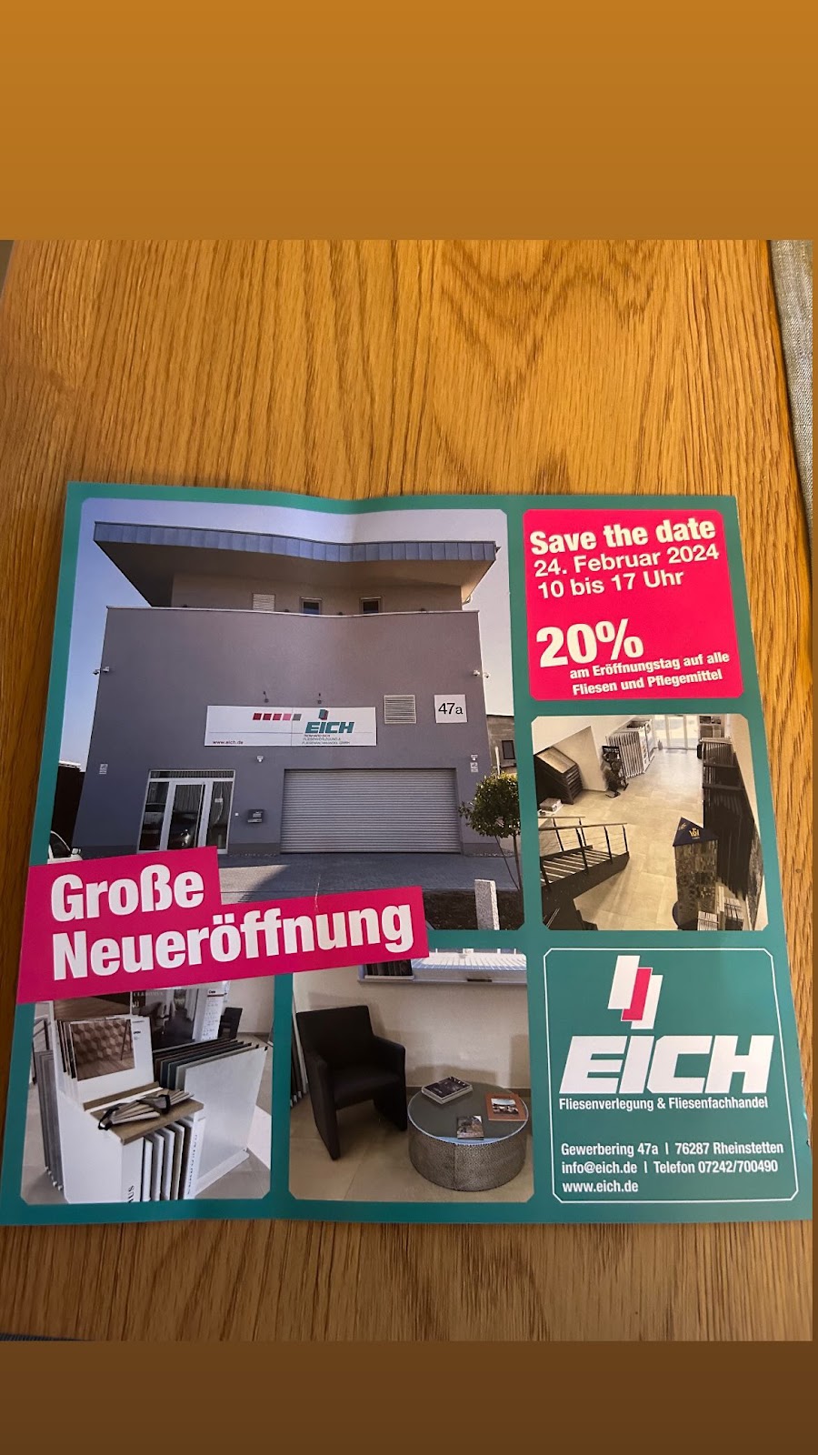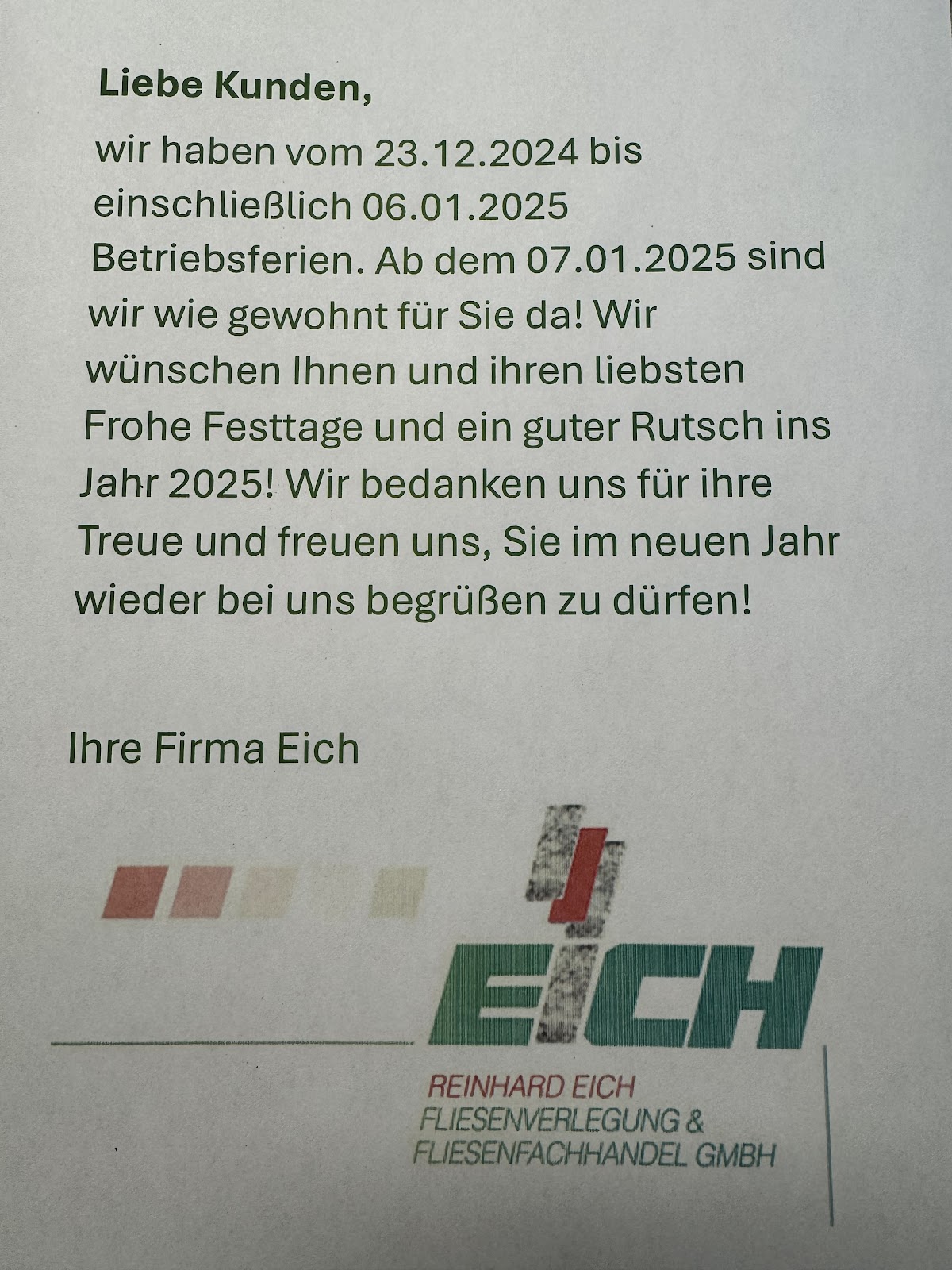 Bei uns waren im Keller nach über 45 Jahren ein paar Fliesen locker geworden und gebrochen, die Firma Eich hat auch einen so kleinen Auftrag prompt übernommen und zu unserer absoluten Zufriedenheit hervorragend gelöst. Der Mitarbeiter „Baba“ war außerordentlich geschickt, freundlich und pünktlich. Er hat alles sauber hinterlassen. So soll es sein, jederzeit gerne wieder und unsere absolute Empfehlung!!!!